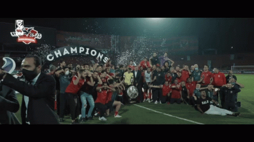 Al Ahly SC football team celebrating their championship victory under a 'CHAMPIONS' arch.