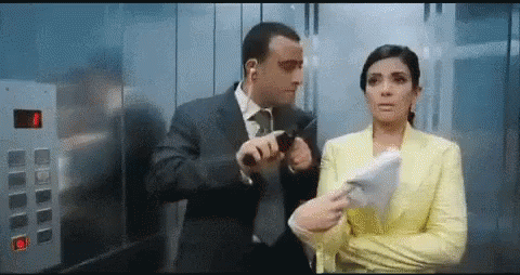 Ahmed El Sakka and Mona Zaki in an elevator scene from Taimour W Shafika, where Ahmed holds a gun.