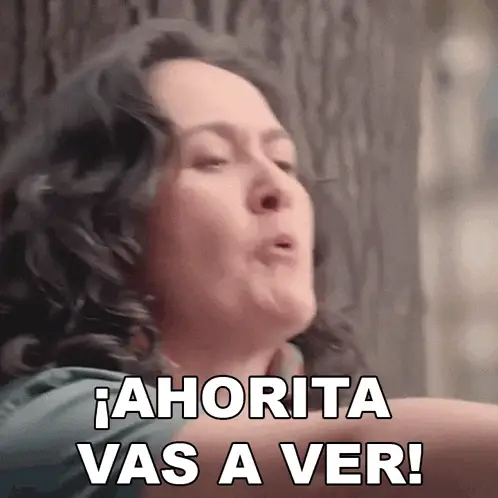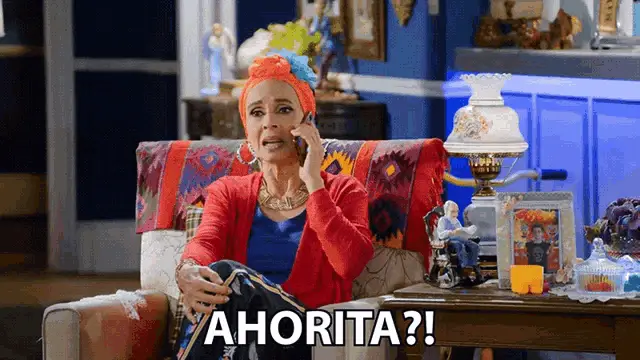 Amparo Conde as Alicia, talking on a cell phone with 'AHORA MISMO' text, from the Colombian series Vecinos.