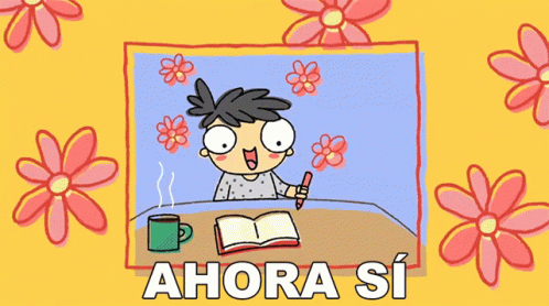 Ana Oly, a cartoon character, is ready to write at a desk with a cup of coffee and an open book.