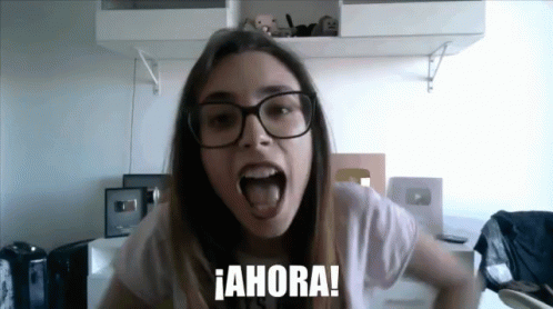 Lyna, wearing glasses, shouts '¡AHORA!' with intensity, pointing her finger in a demanding gesture.
