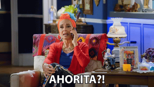 Macaria on the phone, reacting with a surprised 'Ahorita?!' while sitting on a colorful couch.