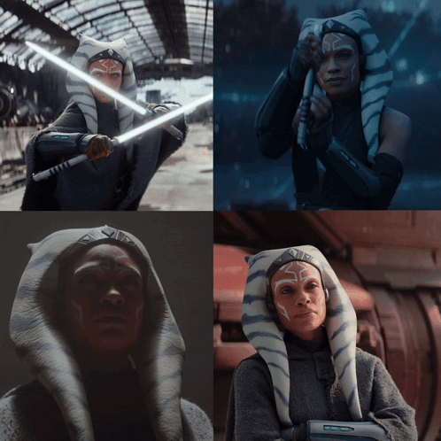 Ahsoka Tano, portrayed by Rosario Dawson, in a collage of moments from the Star Wars series, wielding lightsabers.