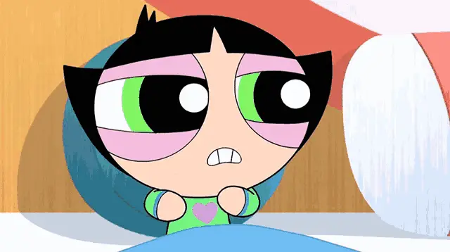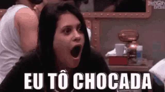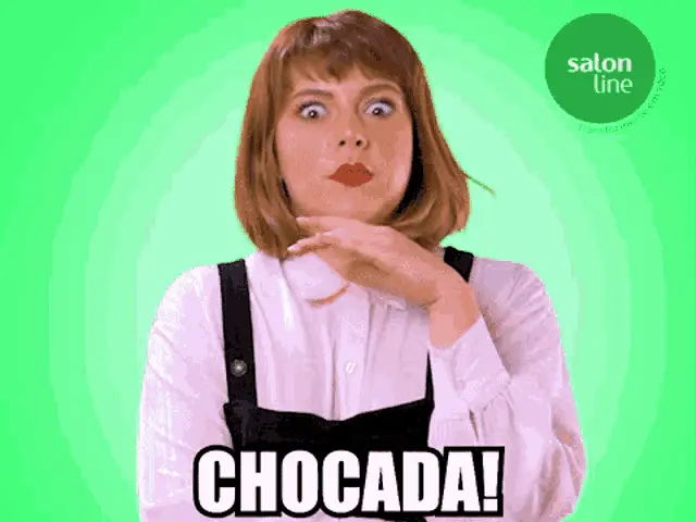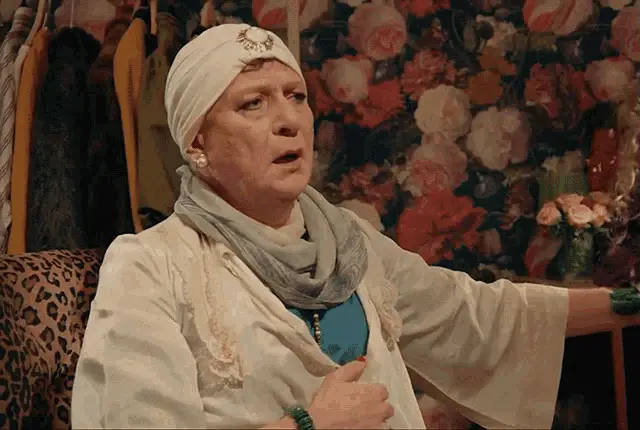 Karen Bachini reacts to her dramatic makeup, exclaiming 'Oh, look at my face!' with a hand to her mouth.