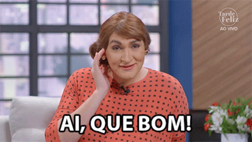A woman on a Brazilian TV show exclaims 'Ai Que Bom!' in a satirical sketch, gesturing with her hand.
