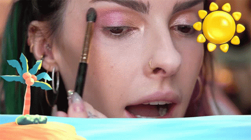 Karen Bachini applies pink eyeshadow, celebrating summer with the phrase 'Ai, que delícia o verão'.