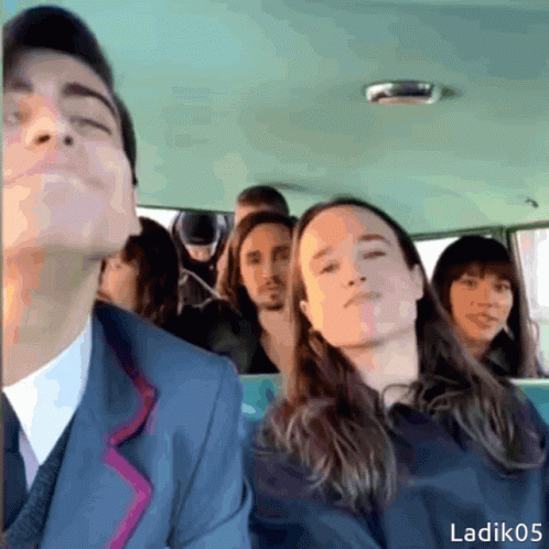 Aidan Gallagher, known as Five Hargreeves, with fellow Umbrella Academy cast members in a car.
