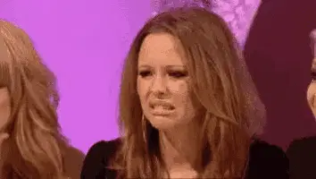 A woman with a disgusted expression reacts to something unseen, exclaiming "Aiii, Credo" in Portuguese.