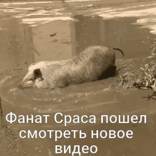 айкакпросто стас: A pig wallows happily in a muddy puddle, accompanied by a Russian caption about 'Sras's fan watching a new video'.