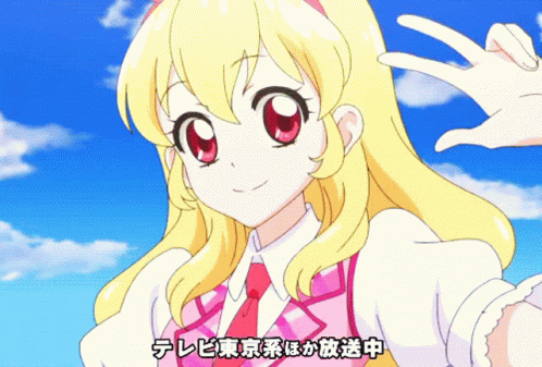 Vibrant Aikatsu anime clip featuring a blonde girl smiling and multiple characters dancing against a colorful, sparkly background.
