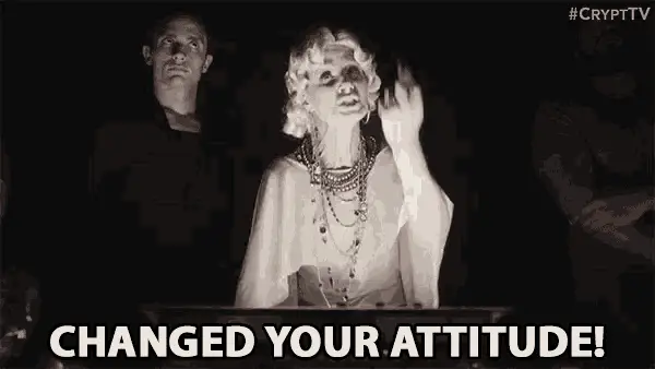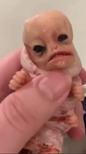 Ailen Saucekay, a strange, small creature or doll with an open mouth, held in a hand, appearing to yell.