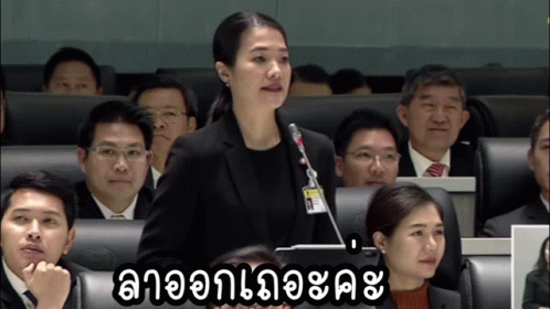 Thai politician ธีรรัตน์สําเร็จวาณิชย์ (Aim) speaking, with the caption 'Please resign.'