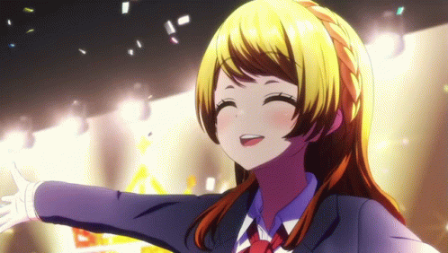 Aimoto Rinku from D4DJ First Mix smiles brightly and waves, surrounded by confetti.