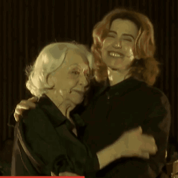 Fernanda Montenegro and Fernanda Torres share a warm embrace, smiling at an event related to 'Ainda Estou Aqui'.
