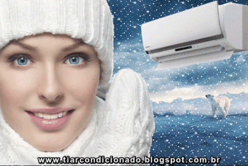 A woman in winter attire, a polar bear, and an air conditioning unit, illustrating winter comfort with AC.
