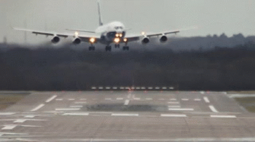 A large passenger airplane approaches and lands on a runway, with smoke rising from its tires upon touchdown.