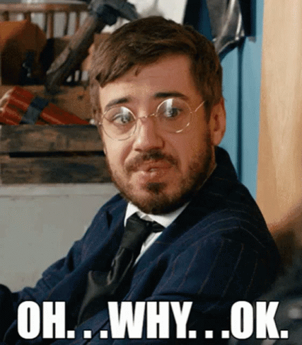 Aj Holmes reacts with a hesitant 'Oh... Why... Ok.' expression, wearing glasses and a suit.