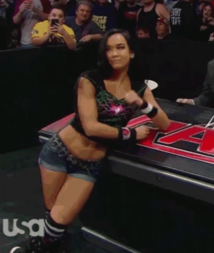AJ Lee, dressed in wrestling attire, waves and smiles while leaning on a table at a WWE Raw event.