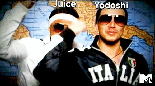 Juice and Yodoshi, wearing sunglasses and an "Italia" jacket, pose for a picture against a map.