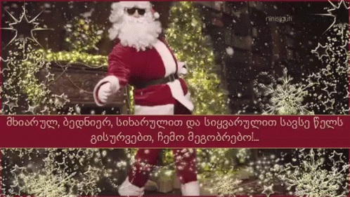 Santa Claus in sunglasses dances joyfully in front of a festive Christmas tree, wishing a happy New Year.