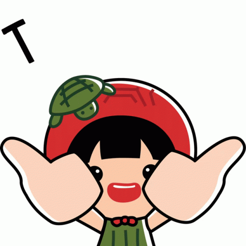 Akkg Ang Ku Kueh Girl, with a turtle on her head, gives a cheerful thumbs up.