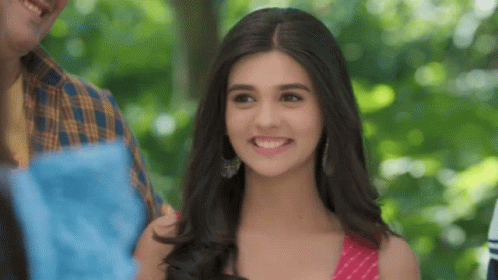 Pranali Rathod as Akshara Goenka smiles brightly in a pink top against a green background.