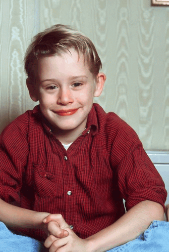 Молодой актер Макалей Калкин, известный по фильму "Один дома", улыбается для камеры в красной рубашке.