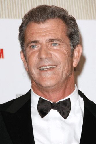 Mel Gibson, the acclaimed actor and filmmaker, smiles while wearing a tuxedo and bow tie at an event.