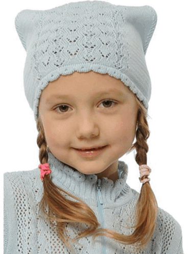 Young actress Ekaterina Starshova smiling in a light blue knitted cat-ear hat and matching sweater.