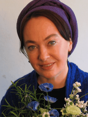 Larisa Guzeeva smiling, wearing a purple head covering and holding a bouquet of blue flowers.