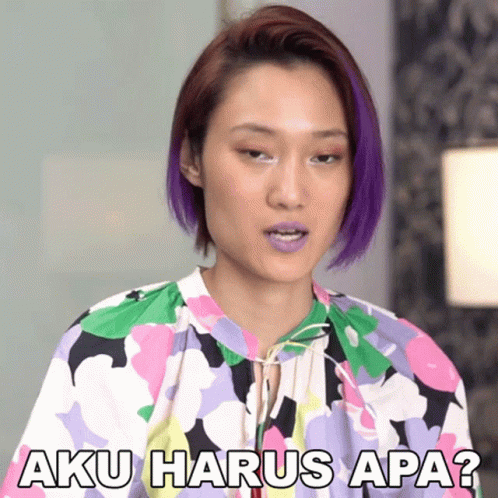 Ayu Gani, with purple hair, asks 'Aku Harus Apa?' (What should I do?) while wearing a colorful floral top.