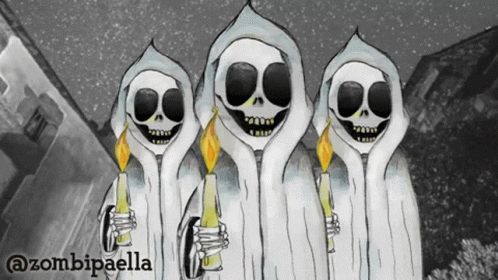 Three hooded skeletons holding candles, with the artist's name @zombipaella visible in this animated drawing.