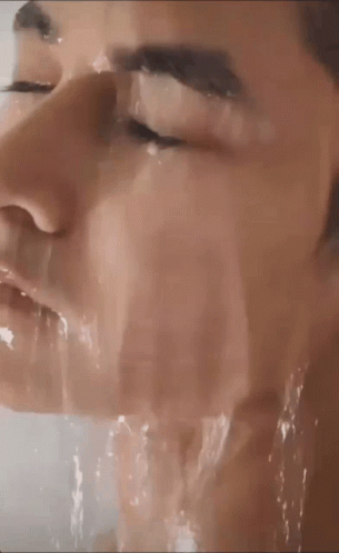 A person's face is refreshed by water, eyes closed, in a close-up shot, evoking a sense of cleanliness.