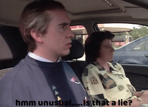 Alan Partridge questions if something is a lie, looking suspicious in a car with a woman.