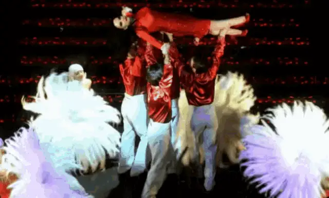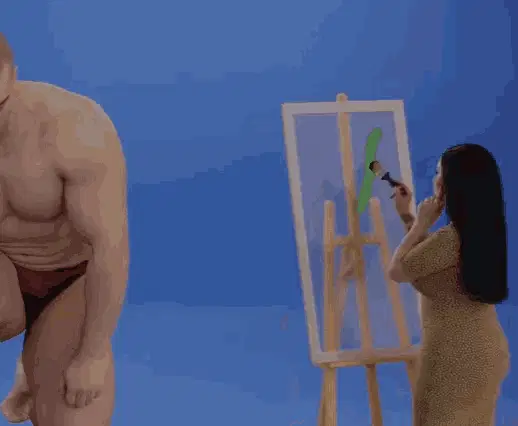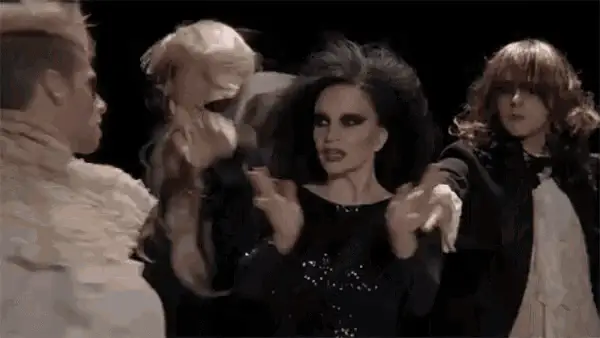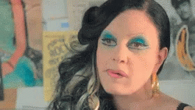 Alaska Fangoria with striking blue eyeshadow and gold hoop earrings, chewing gum and giving an eye roll.