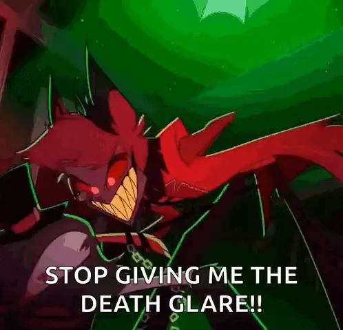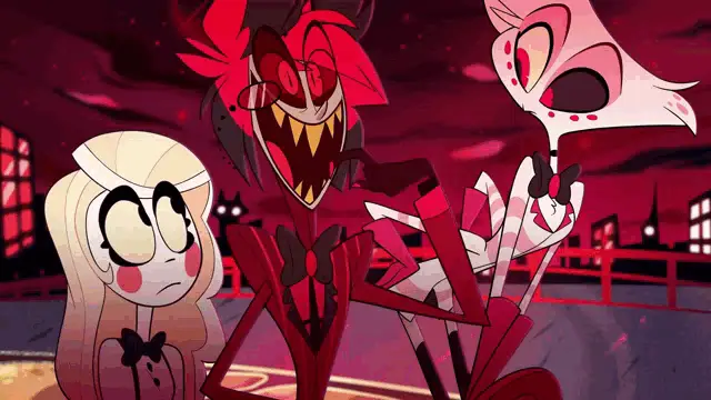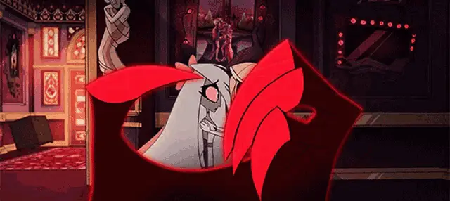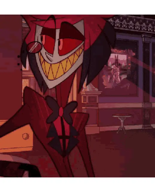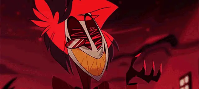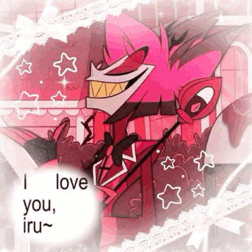 Alastor from Hazbin Hotel expresses affection with the text 'I love you, iru~' on screen.