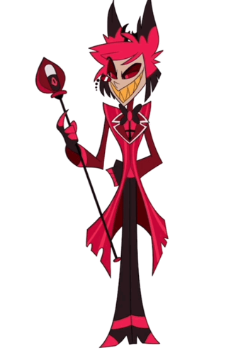 Alastor from Hazbin Hotel, the charismatic Radio Demon, stands with his signature microphone-cane and a wide grin.