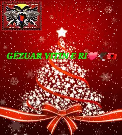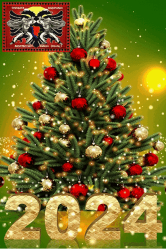 Festive Christmas tree with red and gold ornaments, celebrating Happy New Year 2024 with Albanian spirit.