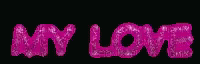 The word 'love' sparkles in pink glitter on a black background, representing 'Albania My Love'.