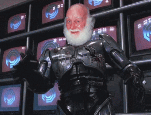 Albert Robocop, a man with a beard, stands in front of a wall of televisions, smiling.