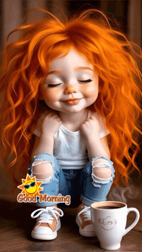 Cute animated girl with red hair wakes up, smiles, and enjoys her morning coffee. A cheerful 'Good Morning' message.