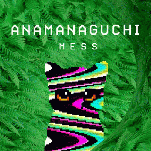 Anamanaguchi's 'Mess' album cover featuring a colorful pixelated cat and chiptune aesthetic.