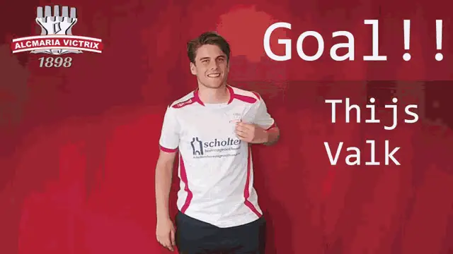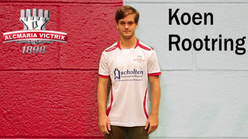 Koen Rootring celebrates a goal for Alcmaria Victrix, standing proudly in front of the club's wall.
