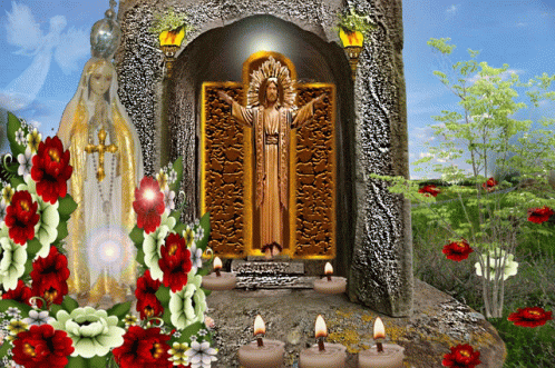 A beautiful religious scene featuring Jesus, Mary, angels, flowers, and lit candles, evoking a blessing.