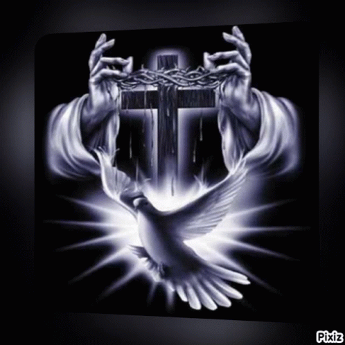 A powerful image depicting divine hands holding a cross with a crown of thorns, a radiant dove, and glowing light.