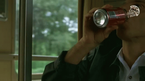 Aldo Giovanni enjoys a refreshing soda, exclaiming 'Bella fresca' and 'È andata giù che è un piacere'.