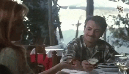 Giovanni interacts with a woman, while Aldo and Giacomo comically eat lemons at a restaurant table.