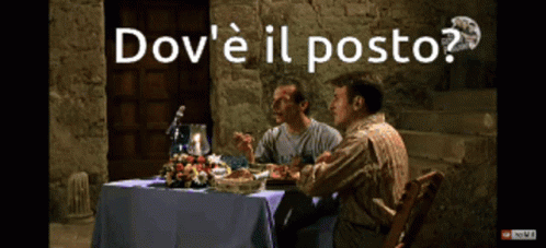 Aldo Giovanni e Giacomo in a comedic sketch, asking 'Where is the place?' at a restaurant table.