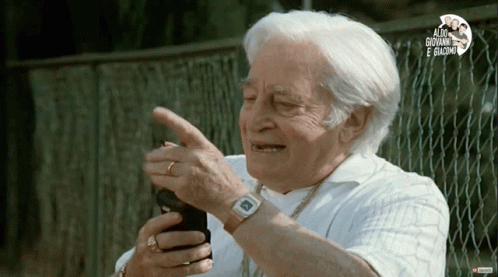 Aldo Giovanni e Giacomo's Manco Er Telefono features an older man reacting emotionally while holding a phone.