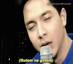 Alden Richards singing into a microphone, with the Tagalog caption 'Gutom na gutom' (Very hungry).